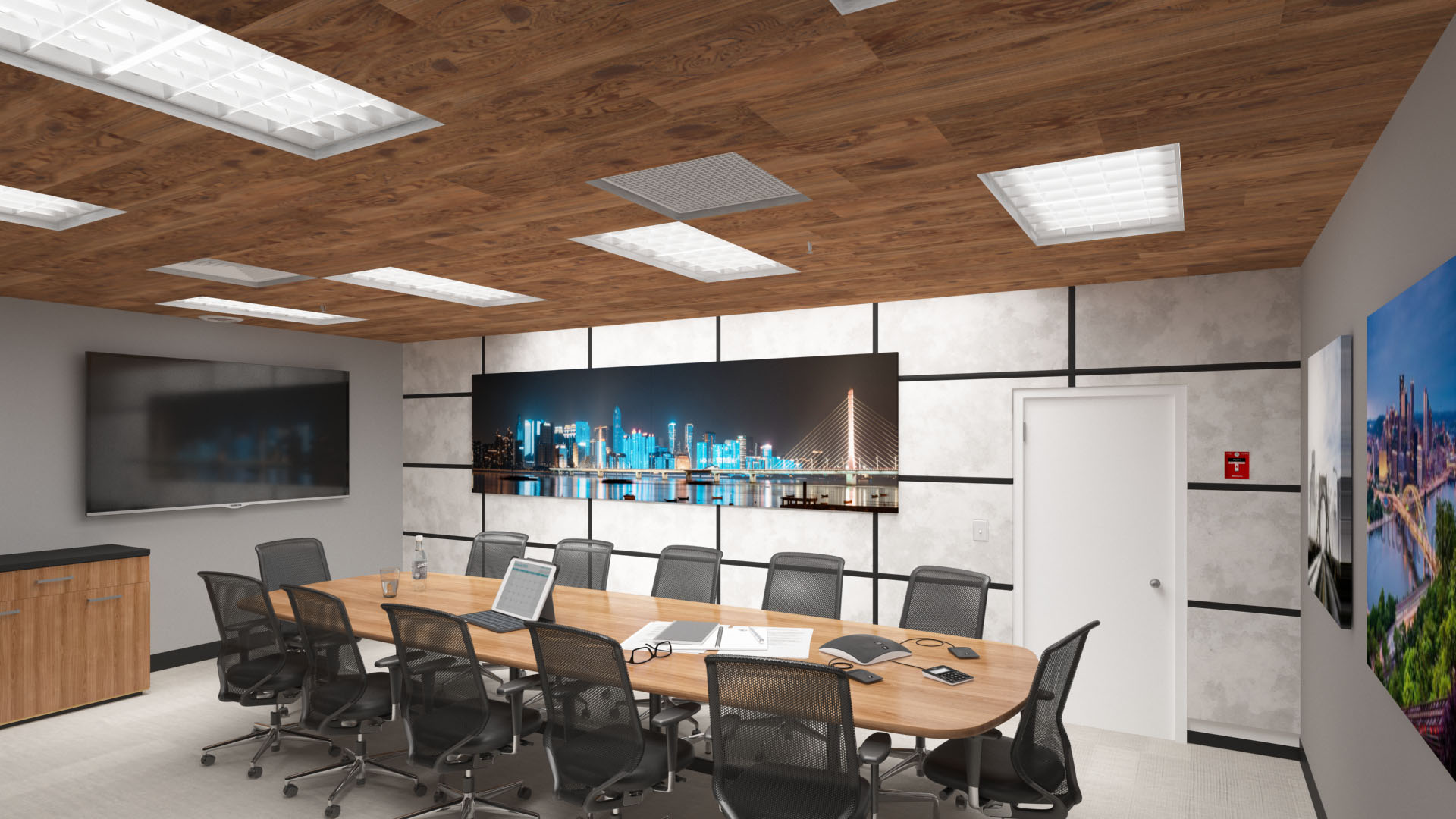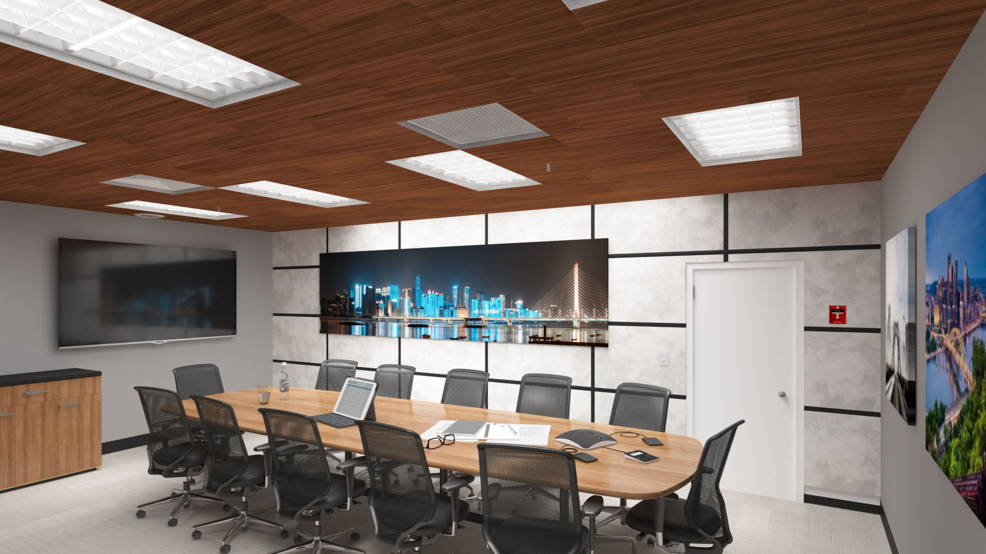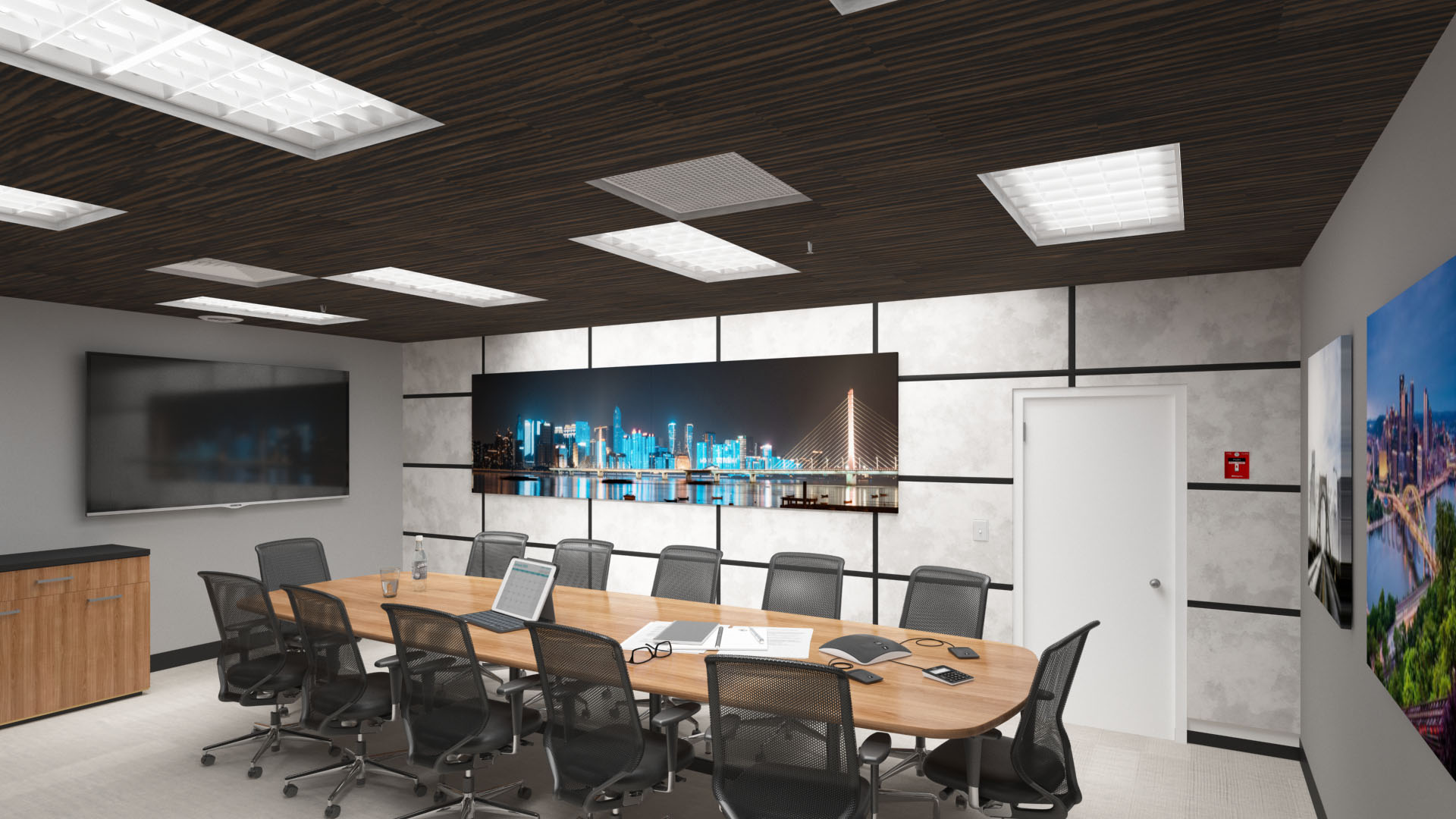 If wall treatment isn’t an option, ceiling treatment can help eliminate these annoying sound issues. In conference rooms with high ceilings, suspended absorption options like Acoustic Clouds or Acoustic Baffles will help to reduce echo and lower the acoustic ceiling of a conference room, while direct mount or drop ceiling options like Acoustic Ceiling Tiles allow your sound absorption to blend into your space.